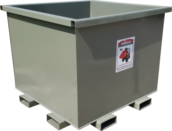 The Monkey Box is designed for the collection and storage of scrap and bulk material. It also has the added ability to be stacked when full and dumped using a forklift equipped with fork rotating attachment. The heavy duty 6500 lbs. capacity box is available in 2, 2.5, 3.5 4, 4.5 and 5 cubic yard models. Along with these standard boxes we can custom design and build a box to meet your specific application. Our standard model has 2-way entry channel with 4-way entry option available and the following upgrades casters, lids, lifting eyes and option paint colors. Standard heavy duty model includes following construction features: