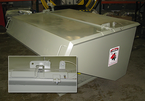 Our center hinged, steel lids allow the front and/or back of the lid to be raised independently or latched down for security while dumping. [construction sites, cnc machine shops, plant maintenance, limited space operations, etc.]